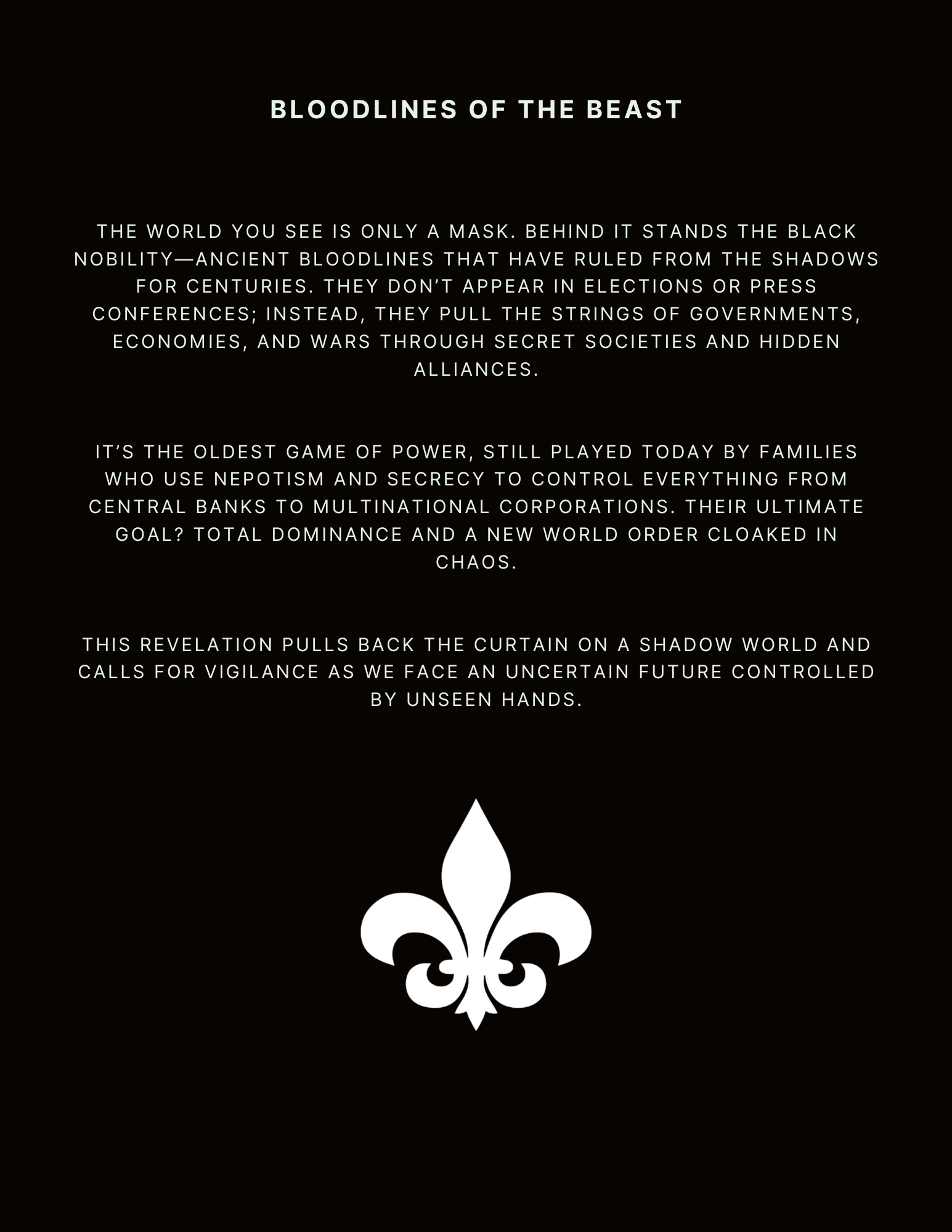 It’s the oldest game of power, still played today by a global elite who use nepotism and secrecy to control everything from central banks to multinational corporations. Their ultimate goal? Total dominance and a new world order cloaked in chaos.