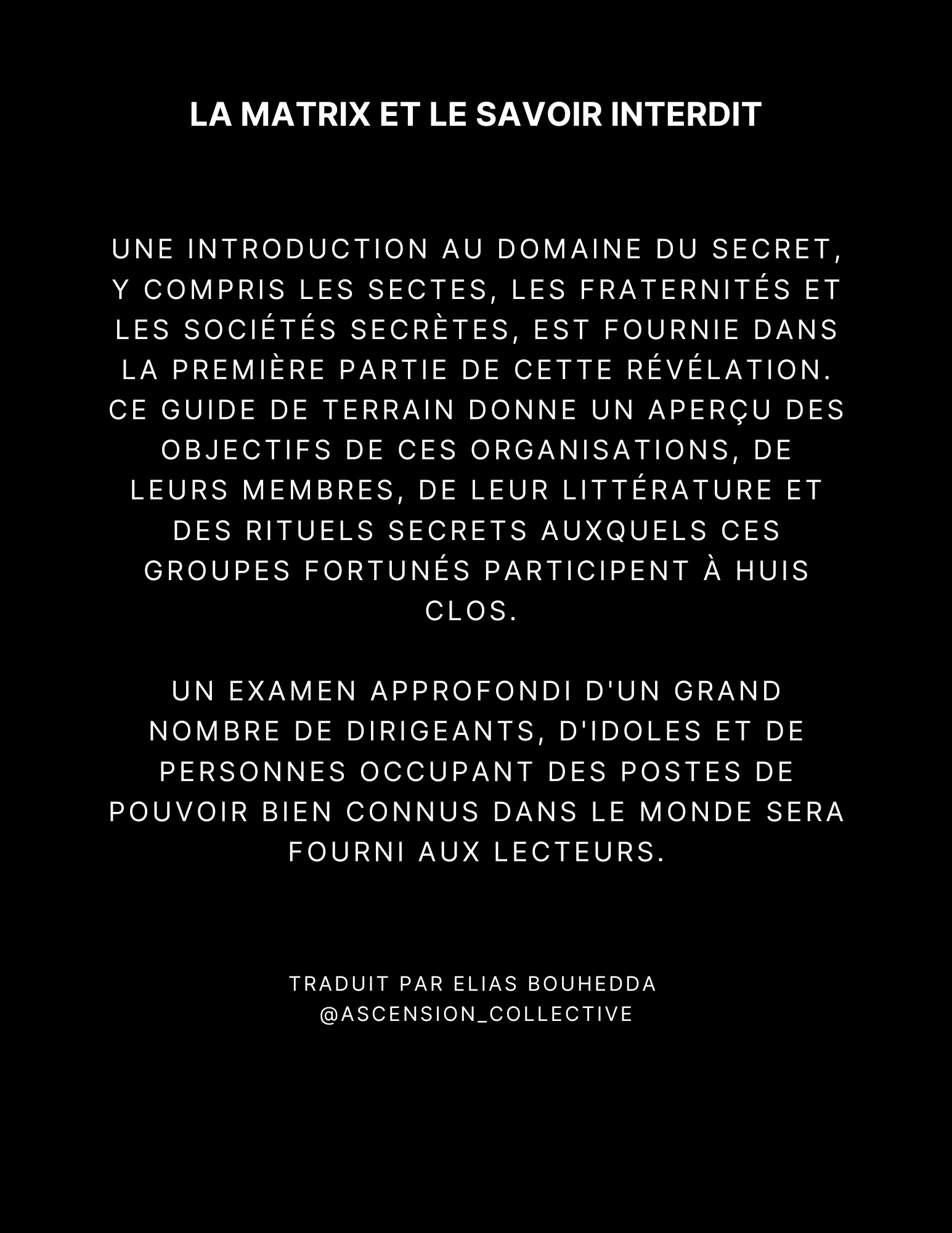 Une introduction au domaine du secret, y compris les sectes, les fraternités et les sociétés secrètes, est fournie dans la première partie de cette révélation. Ce guide de terrain donne un aperçu des objectifs de ces organisations, de leurs membres, de leur littérature et des rituels secrets auxquels ces groupes fortunés participent à huis clos. Un examen approfondi d'un grand nombre de dirigeants, d'idoles et de personnes occupant des postes de pouvoir bien connus dans le monde sera fourni aux lecteurs.